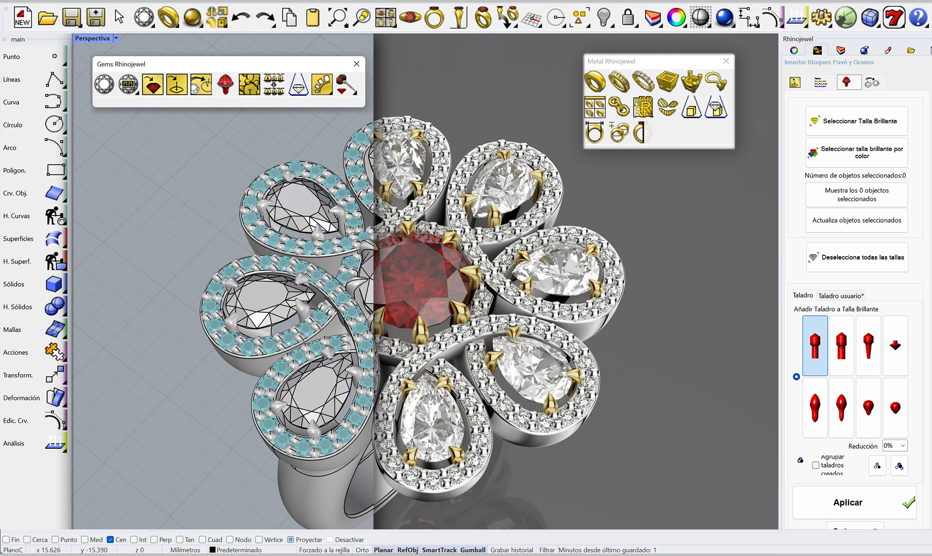 RhinoJewel es el plugin que transforma Rhino en una potente herramienta para crear joyas con Rhinojewel. Añade piedras preciosas y materiales gemológicos, crea pavés y texturas precisas, genera imágenes y vídeos para tus redes sociales. Rhinojewel multiplica la potencia de Rhino, permitiéndote crear impresionantes diseños de joyería con facilidad y fluidez.
